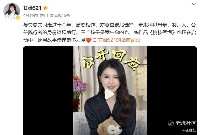 5月14日午间,甘薇在社交平台发布出镜视频,官宣与贾跃亭离婚。视频中,她说道:“与贾总共同走过十余年,感恩相遇,亦尊重彼此选择。未来将以母亲、制片人、公益践行者的身份继续前行。三个孩子是我生命的光。”