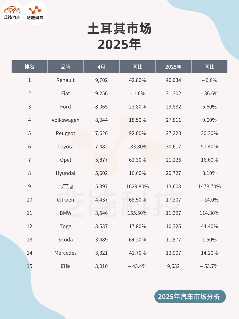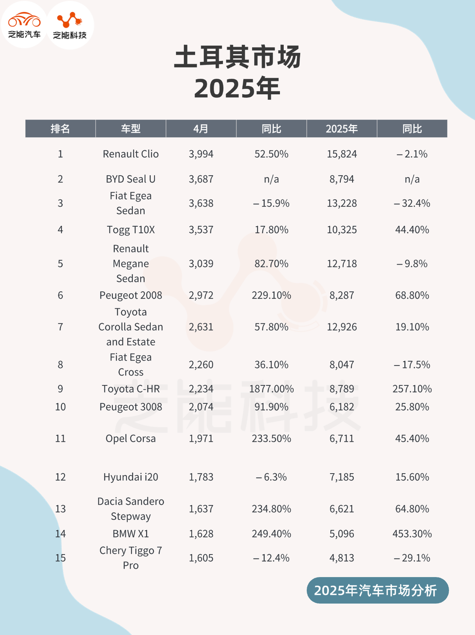 在2025年4月的土耳其市场中,中国汽车品牌集体实现跃升。其中,比亚迪的表现最为耀眼,以5,397辆、5.1%的市场份额冲至品牌榜第九位,同比暴增1629.8%,不仅刷新其在土耳其市场的历史最佳成绩,也首次在品牌榜中跻身前十。