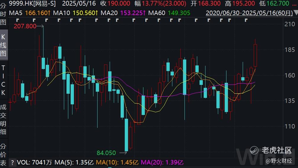 5月16日,网易(9999.HK)在港股大幅高开,全天都在绝对高位运行,最终涨13%,收于190港元/股,总市值再次突破6000亿港元,换手率为13.5%,交易额大幅放大。