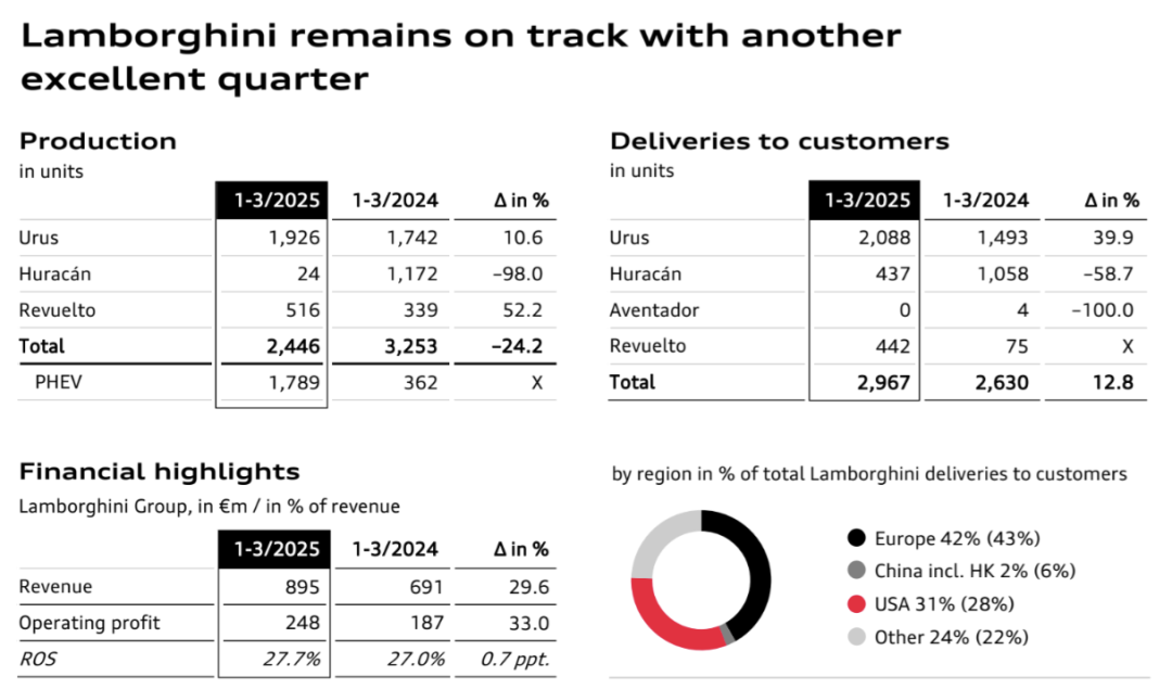 ● 相比之下,兰博基尼则延续其在超豪华细分市场的强势表现,交付量逆势上涨12.8%,超跑Revuelto在V12插混技术驱动下成为季度明星产品。