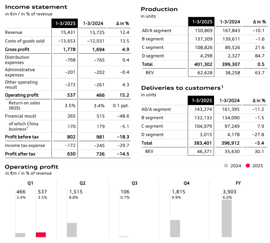 奥迪集团在2025年第一季度呈现出转型初期典型的双重特征:核心业务面临周期性与结构性压力,电动化布局则逐步显现成效。