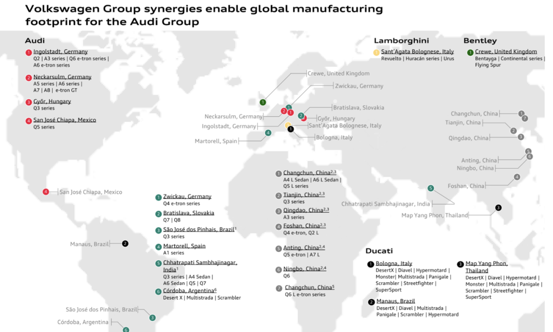 电动车产能显著提升,BEV 产量 62,628 辆(+63.7%),占比 15.4%,主要来自茨维考工厂(Q6 e-tron)和因戈尔施塔特工厂(A6 e-tron)。