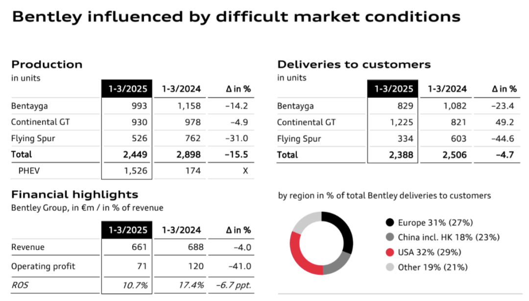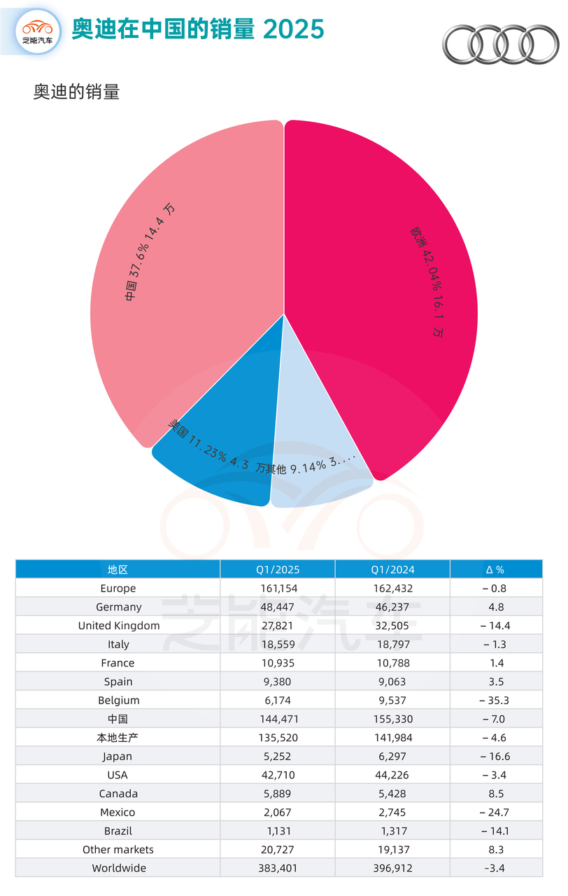 奥迪集团在2025年第一季度交付388,756辆,同比减少3.3%,奥迪品牌下滑最为显著,交付量同比下降3.4%,中国市场作为最大单一市场(占比在37.6%),交付量 144,977 辆,同比下降 7.1%,这个情况和BBA是共性的情况。