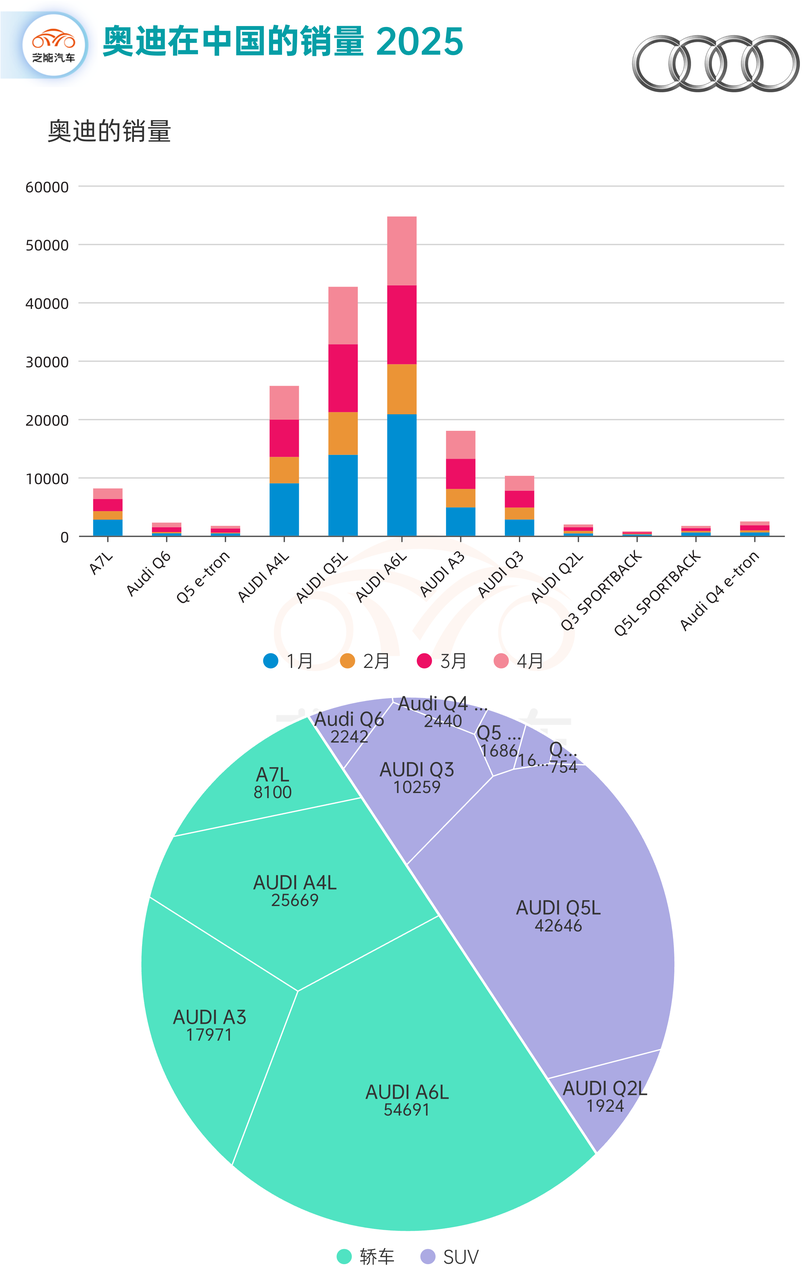 ◎ A6L(54,691辆)与A4L(25,669辆)合计超8万辆,是奥迪品牌稳定的基本盘。