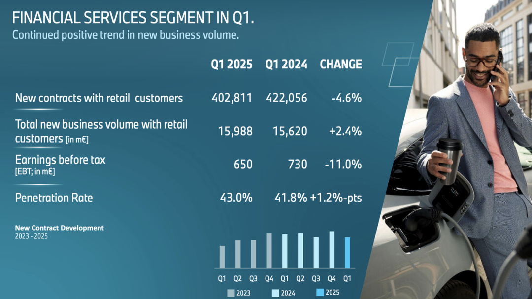 ● 金融服务板块税前利润为6.5亿欧元,同比下降11%,新增租赁合同同比增长2.4%,融资与租赁业务整体保持稳定,新车金融渗透率提升至43.0%,相比去年同期增长1.2个百分点。