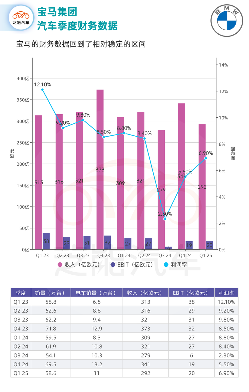 2025年第一季度,宝马集团实现营收337.58亿欧元,较2024年同期下降7.8%;若剔除汇率影响,实际降幅达8.7%。净利润为21.73亿欧元,同比下降26.4%,连续多个季度增长态势的暂时中断。