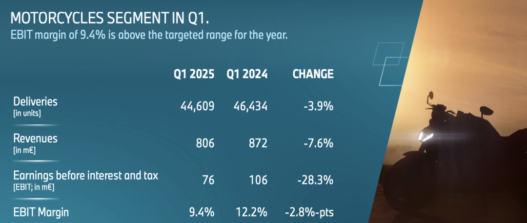 ● 摩托车业务交付量同比减少3.9%,至44,609辆,收入为8.06亿欧元,但EBIT利润率仍达9.4%,超过全年5.5%–7.5%的指引区间,显示出其盈利弹性依旧稳健。