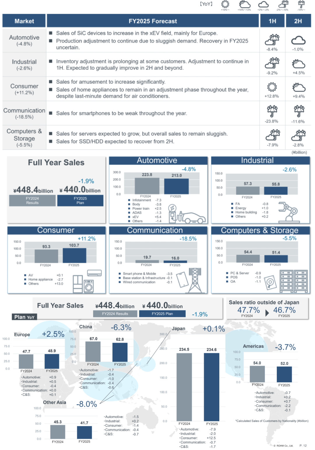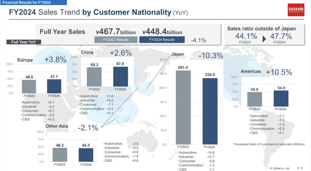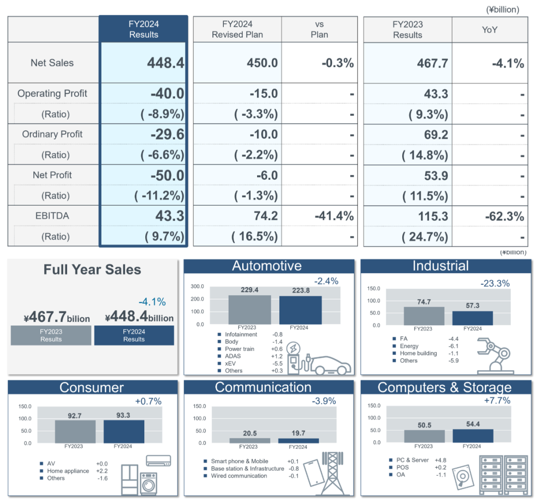 ROHM在2024财年的净销售额为4484亿日元,同比减少4.1%,营业利润和净利润分别亏损400亿和500亿日元,远低于市场预期。