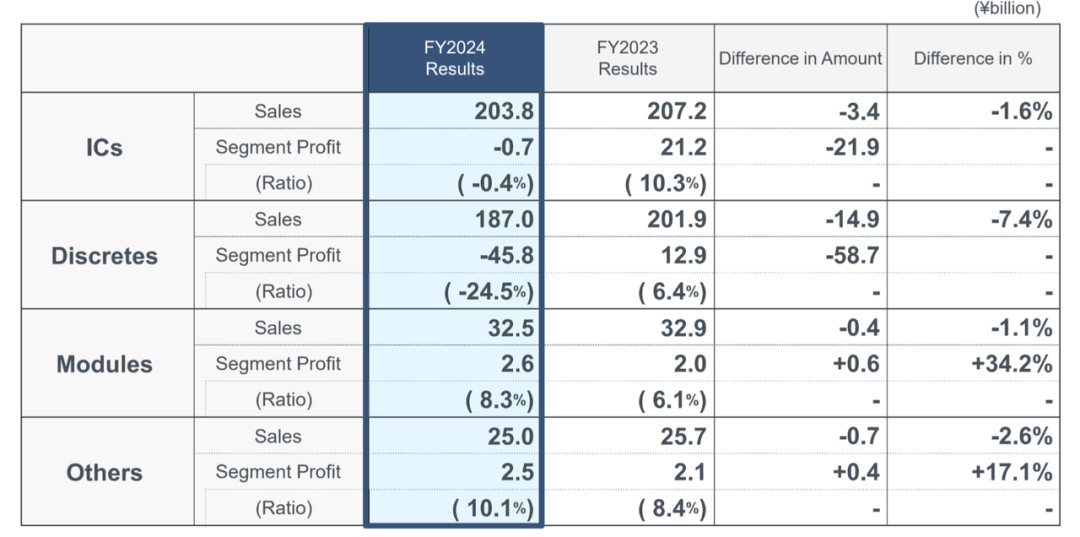产品结构方面,分立器件业务销售额下滑7.4%,营业利润由正转负,亏损达458亿日元,反映功率器件市场竞争加剧以及价格承压。