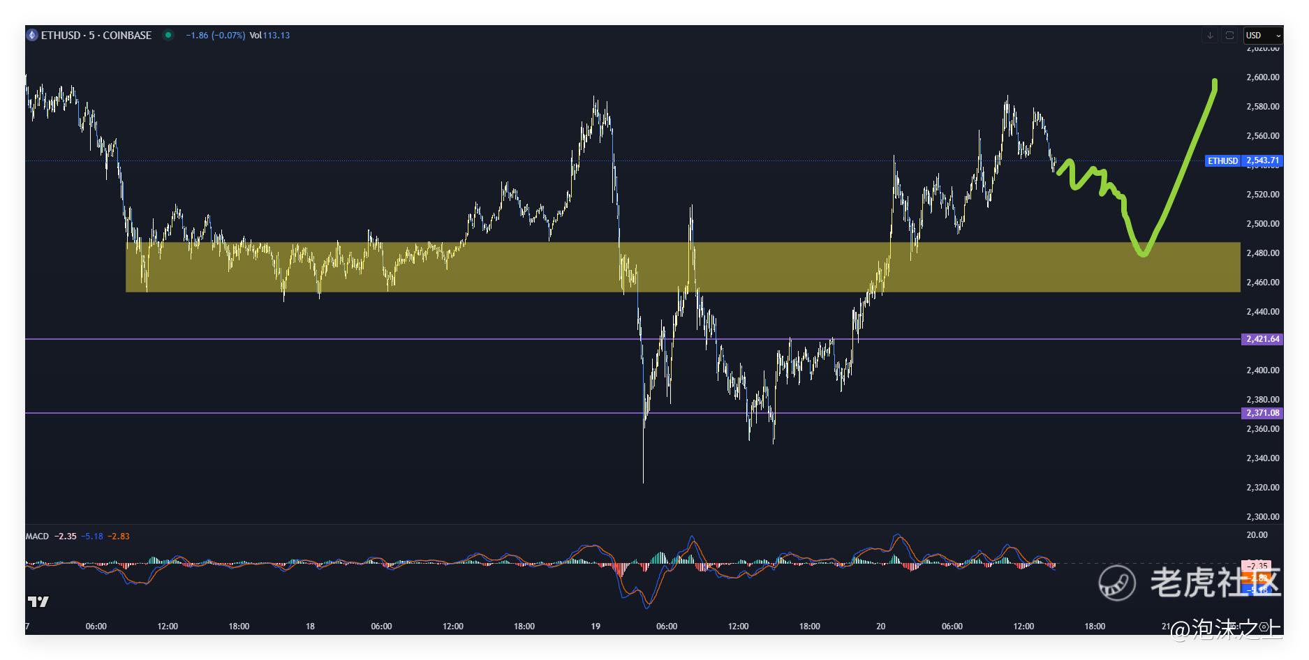 ETH:小双顶跌破,调整到黄色区域有望企稳拉升。