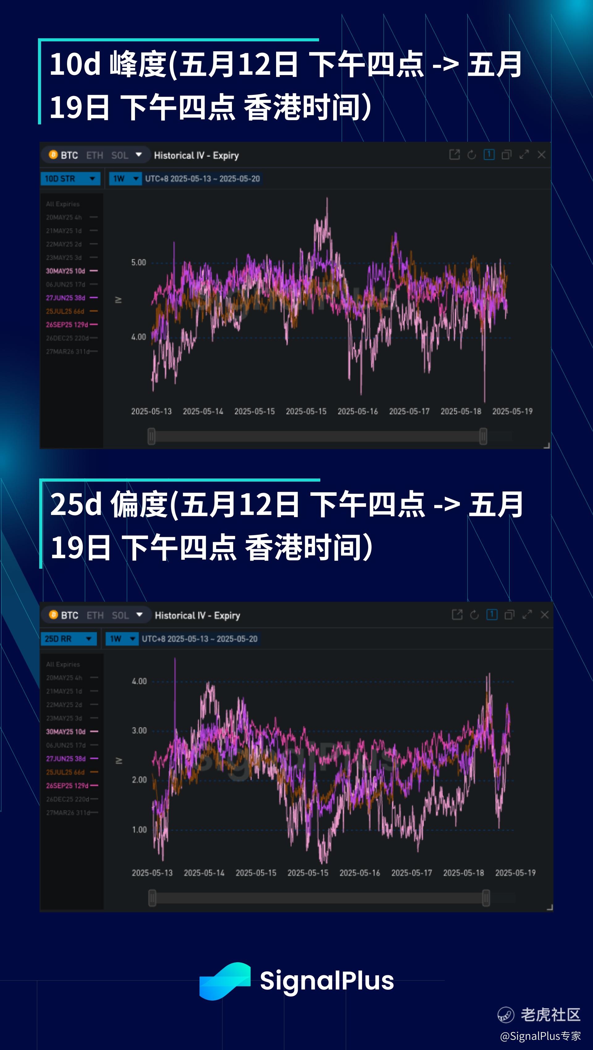 在结束相对稳定的一周后,偏度在周一早上伴随币价突破 106 千美元剧烈偏向上方,但随后非常波动地被拉回 102 千美元,导致偏度跟着回调。但是随着币价在 100-101 千美元有大量的买入需求,市场越来越担心币价会大幅波动上涨超过历史高点,因此偏度价格再次偏向上方。