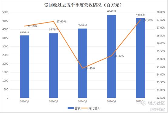 值得一提的是,过去五个季度,爱回收的营收同比增速均保持在24%以上,其中三个季度超过了27%;而2024年Q1,公司已经实现了27.1%的增速,在如此高的基数之下,还能在2025年Q1实现27.5%的增速,足以说明公司在目前中国宏观经济环境和消费市场习惯之下的高成长性。