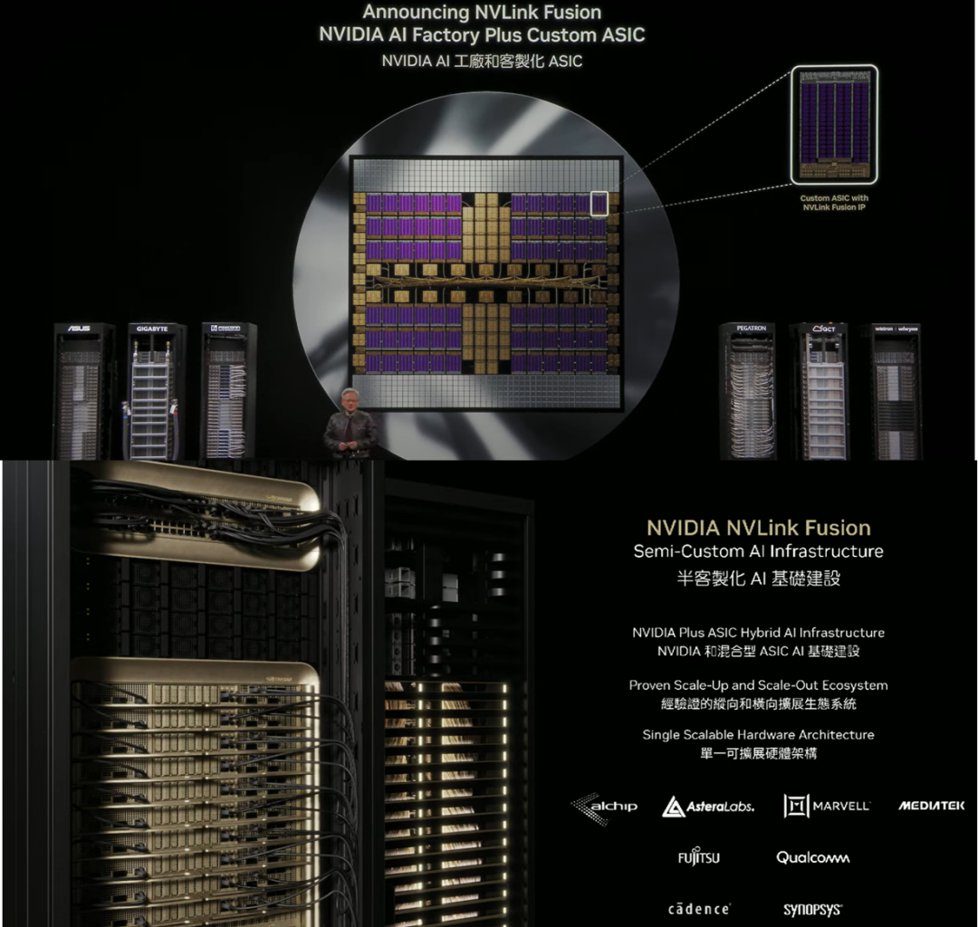 NVLink Fusion的开放战略。过去只为英伟达自用的互连交换架构,如今对Marvell、联发科、高通、富士通等厂商全面开放,允许第三方将其CPU、加速器无缝对接英伟达的GPU。