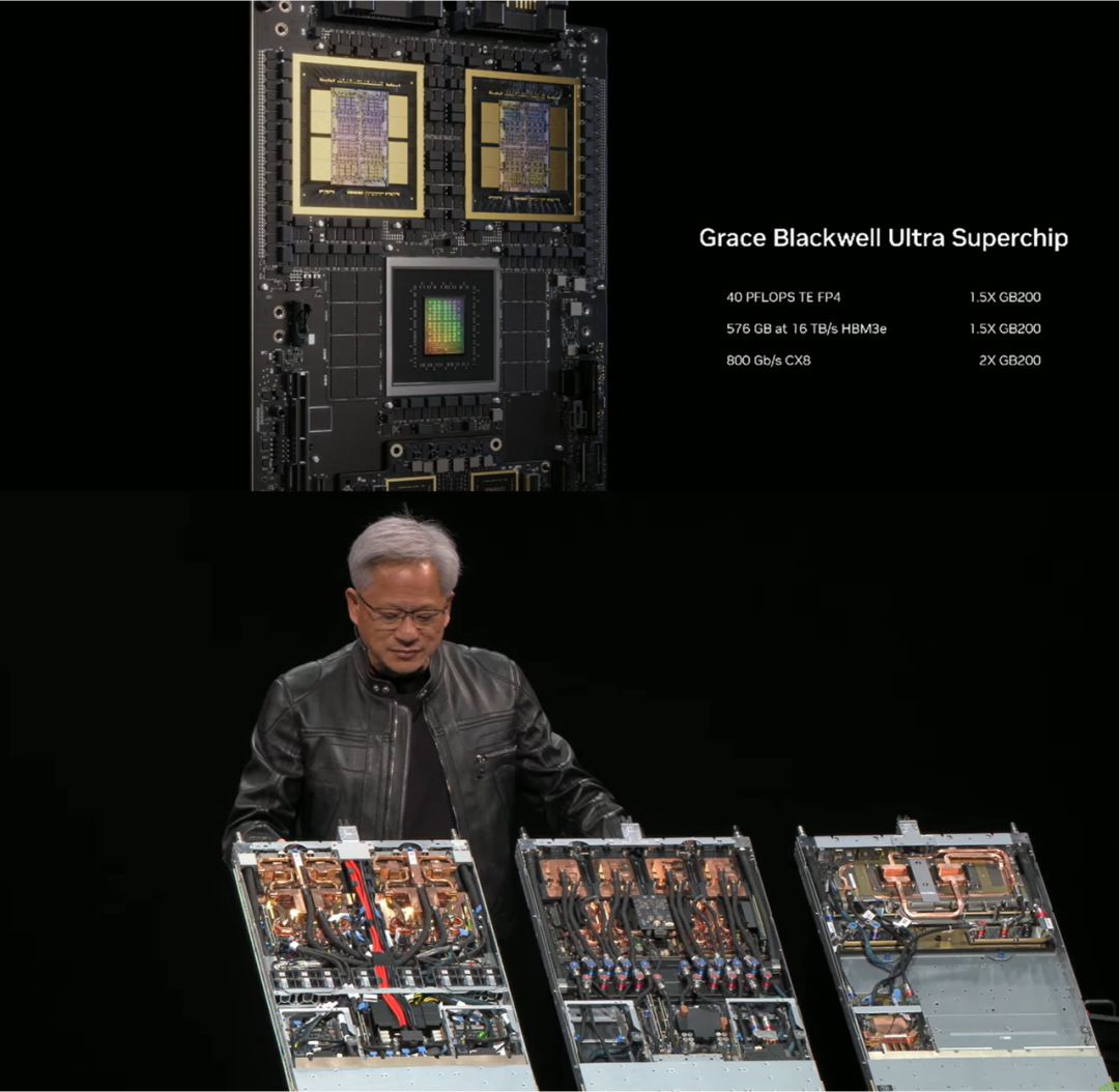 即将于Q3推出的GB300在继承GB200架构优势的同时,对芯片进行了升级。新一代系统在推理性能、内存带宽(HBM)与网络通信能力上分别实现了1.5倍、1.5倍与2倍的跃升。