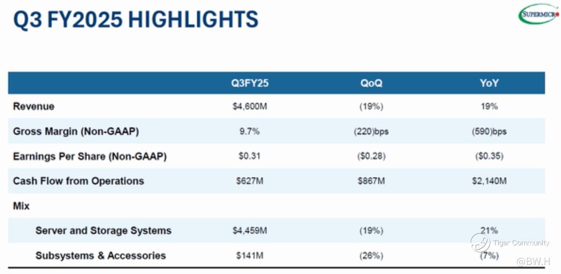 超微电脑Q3营收46亿美元,同比增长19%,但环比下滑19%,远低于公司此前50-60亿美元的指引。核心问题出在客户“选择困难症”——大家都在纠结该买Hopper架构还是等新一代Blackwell架构的产品。