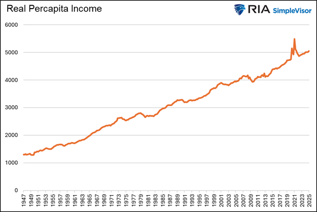 几十年来的通胀确实大幅削弱了美元的价值。1947年1美元的购买力到今天只剩7美分。然而,如下图所示,经通胀调整后的收入却比1947年增长了五倍。虽然美元买到的东西少了,但我们的收入能买到的反而更多!
