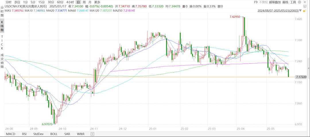 外汇方面,本周美元指数在评级下调,贸易反复和国债拍卖不佳的情况下大跌,周线跌穿此前收盘低点,为2022年4月初以来最低。焦点货币对方面,欧美累涨1.76%,美日累跌2.08%,离岸人民币升至7.17的半年最高水平。