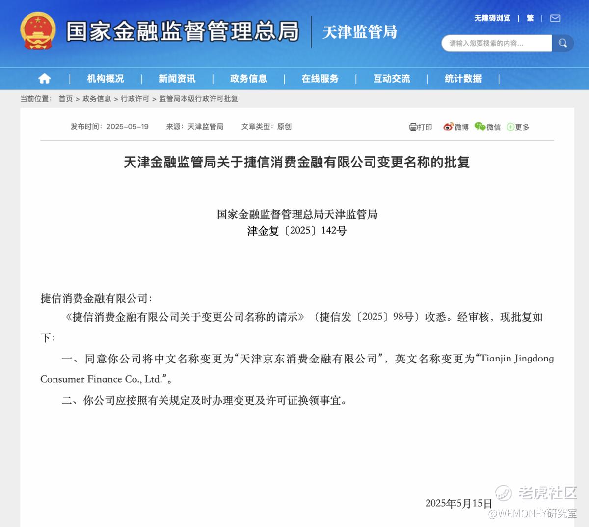 5月26日,WEMONEY研究室关注到,国家金融监督管理总局天津监管局正式批复,同意捷信消费金融有限公司更名为“天津京东消费金融有限公司”(简称“京东消金”),英文名称变更为“Tianjin Jingdong Consumer Finance Co., Ltd.”。