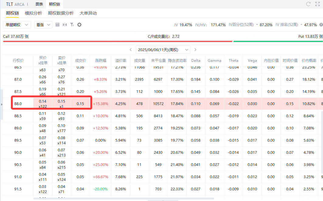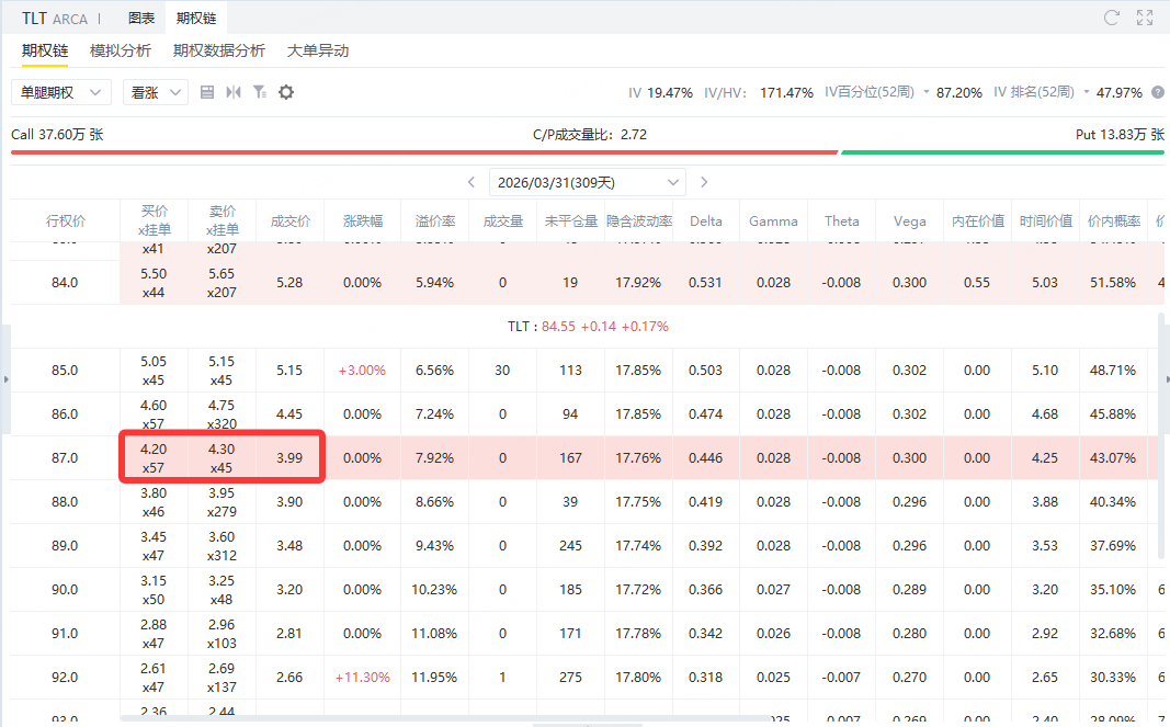 假设投资者在未来一年内都看好 $20+年以上美国国债ETF-iShares(TLT)$ ,可以直接买入行权价87,到期日为2026年3月31日的看涨期权。这个期权即成为我们的多头腿,以最新成交价计算需要花费425美元。