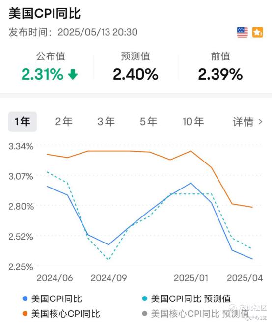 4月CPI同比增速2.31%,低于预期的2.40%,环比增速0.06%,显示通胀压力有所缓解;核心CPI同比2.78%,仍高于美联储2%的目标。
