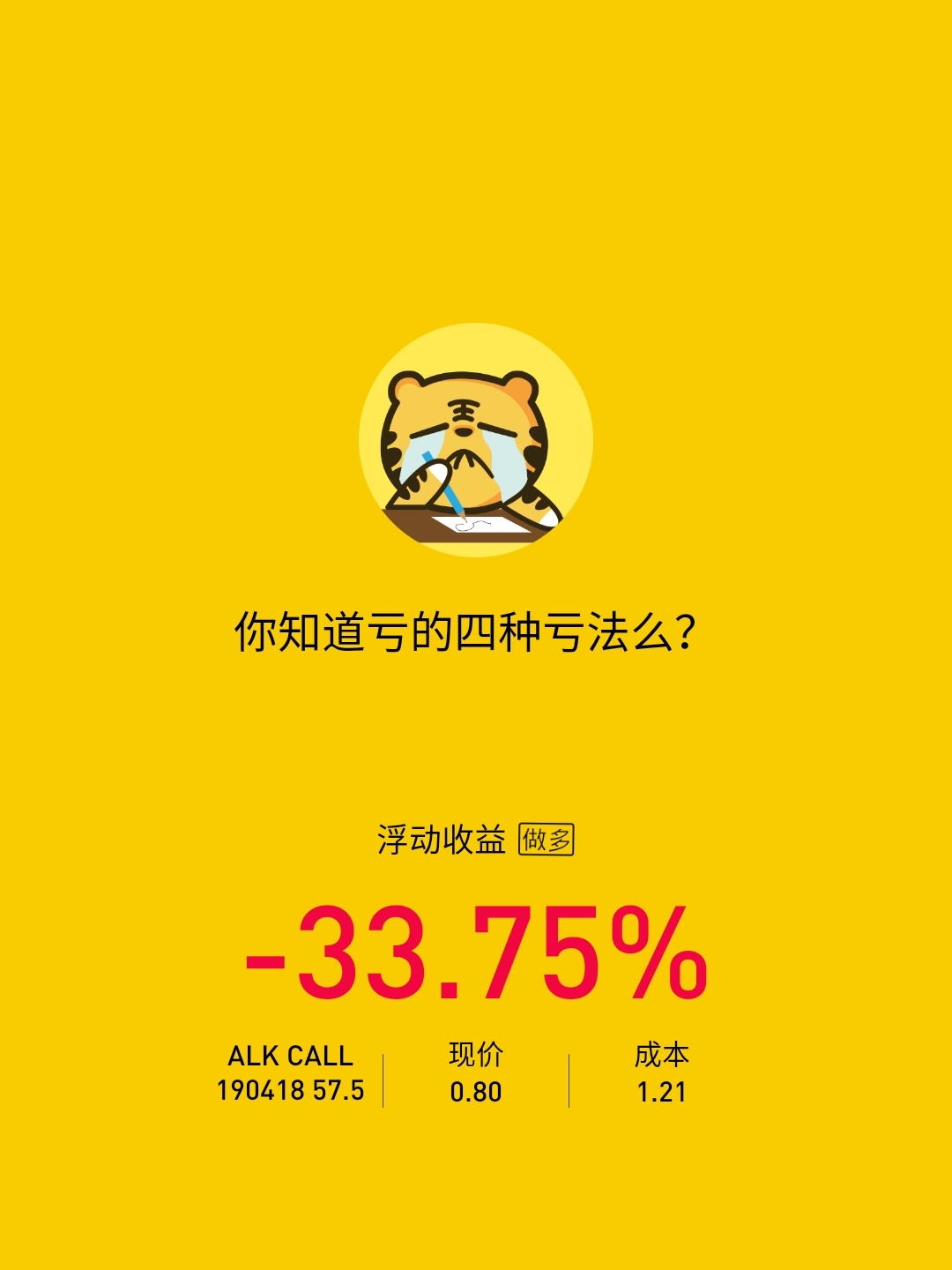 $ALK 20190418 57.5 CALL(ALK)$ 跌之前call的,竟然不涨,影响心态,心情浮躁影响操作,空仓又怕踏空。