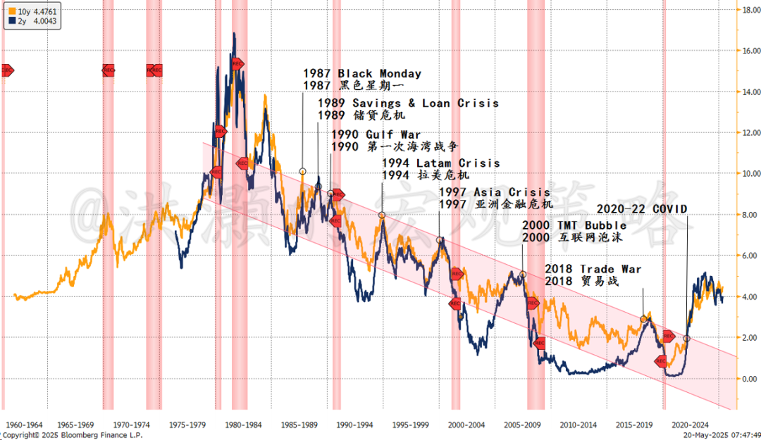 当下,十年美债收益率早已远远突破了它四十多年的下行趋势,并大幅走高(如图)。历史经验告诉我们,过去四十多年里,每一次美债收益率的飙升,都意味着全球无风险收益率的高企和美元流动性的收紧,全球某个市场、某种资产类别,就会出现危机。毕竟,美元是现代货币体系中的最重要的中央储备货币。