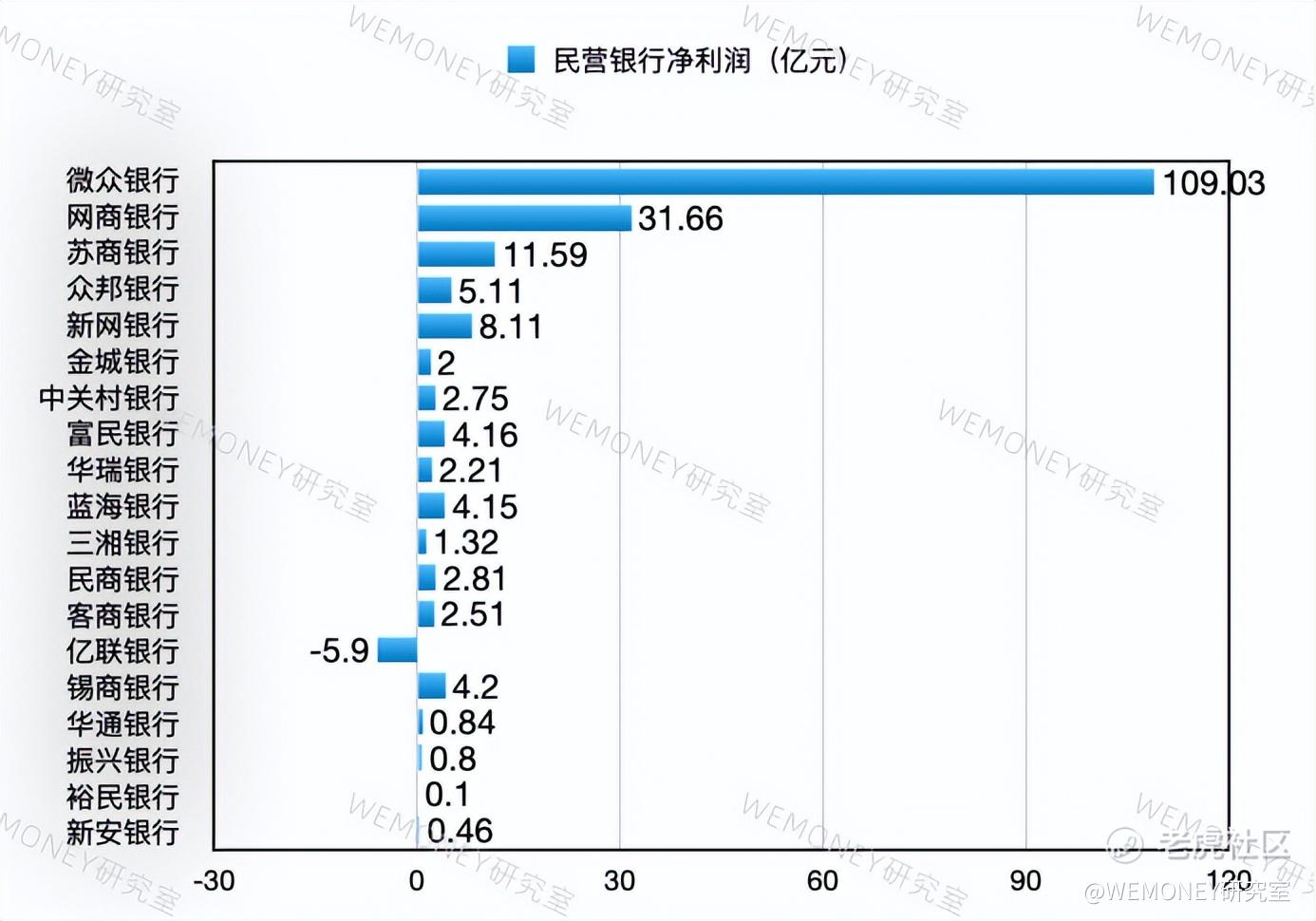 从净利润数据来看,19家银行中仅一家亏损。微众银行实现净利润109.03亿元,微增0.81%,网商银行和苏商银行位列第二、三位,净利润分别为31.66亿元和11.58亿元,裕民银行净利润虽不足1000万元,但同比实现103.46%的增长。从净利润增速看,包括新网银行、中关村银行、振兴银行等在内的9家民营银行净利润同比下降。