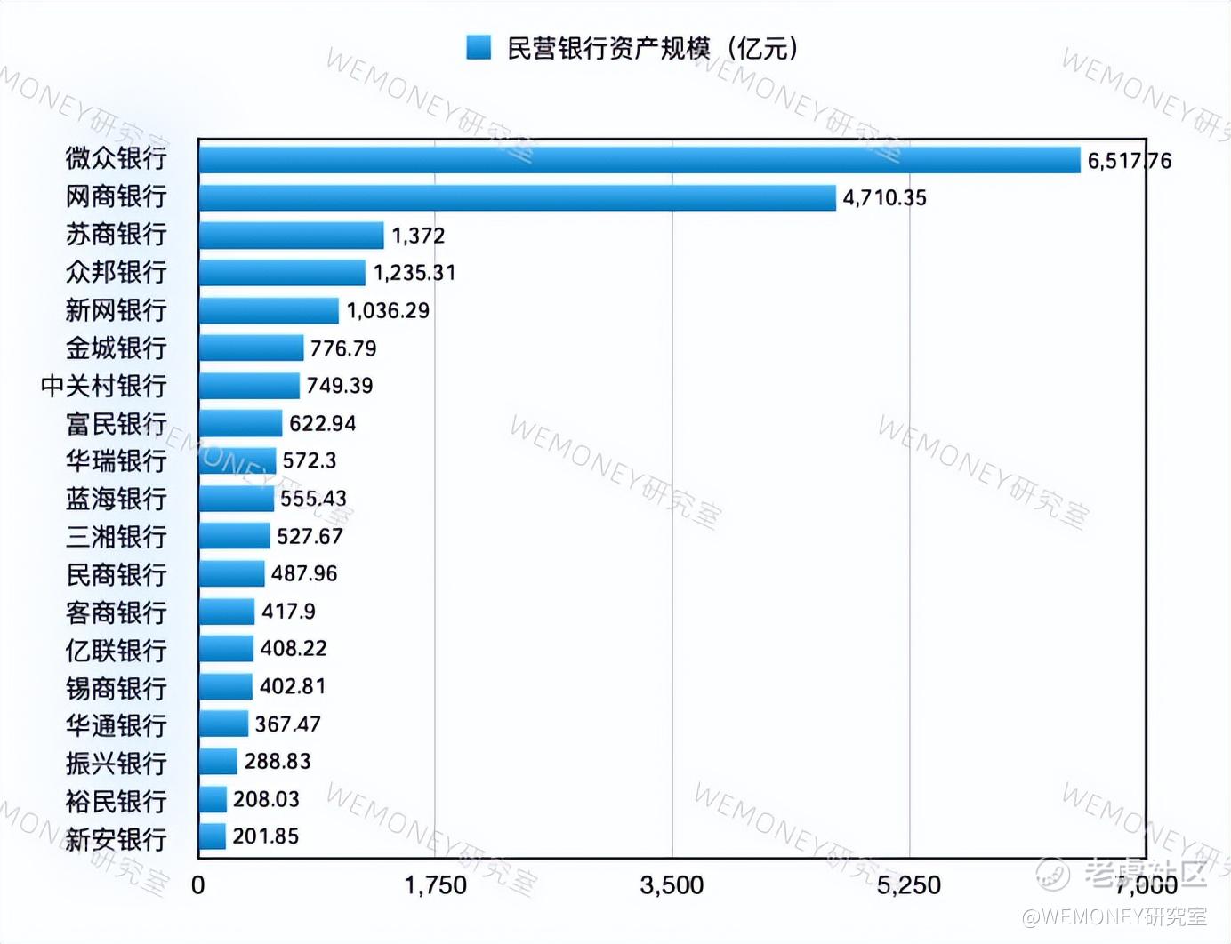 微众银行以6517.76亿元总资产、381.28亿元营收稳居榜首,其净利润109.03亿元超过其余18家总和。网商银行以4710.35亿元资产、213.14亿元营收紧随其后,两家头部机构合计资产规模超1.1万亿元,形成绝对“断层优势”。