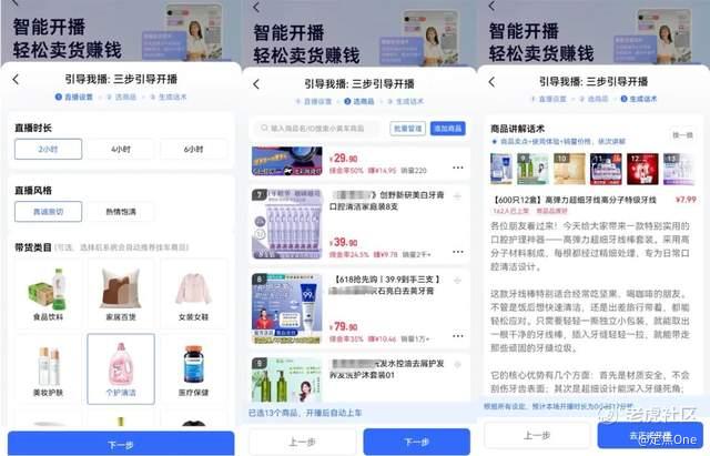 简单来说,这款智能开播工具帮助小白商家三步实现开播:第一步,选择直播时长和带货类目;第二步,在快手的分销库中自主选品;第三步,系统根据商品特征自动生成讲解话术文案,再通过右上角的提词器挂件展示话术。