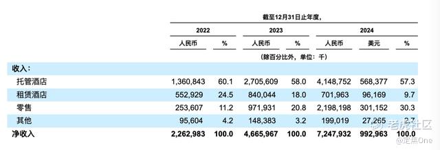 2024年财报显示,其零售占比从20.8%增加到30.3%;酒店管理(含加盟及自营酒店)营收占比从58.0%微降到57.3%,仍是主业。