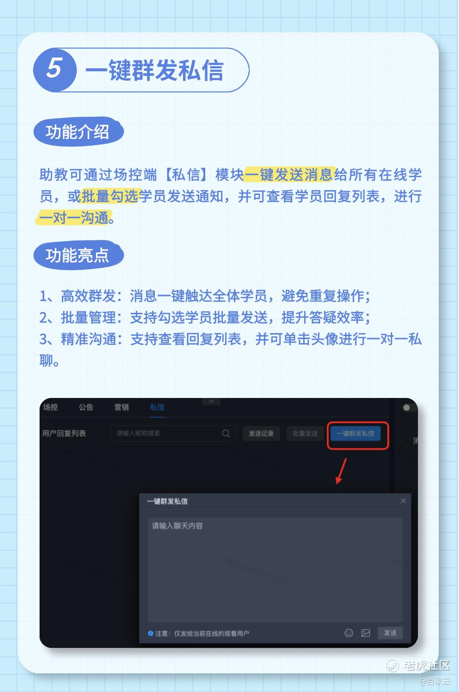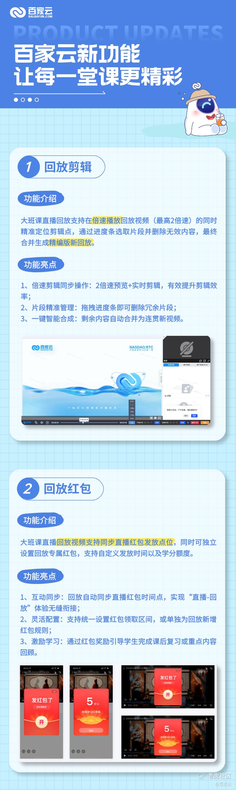 为提升在线教学效率与互动体验,百家云对大班课直播与短训宝进行功能迭代,覆盖剪辑、互动、场控三大核心场景,助力教育机构与教师轻松实现高效教学。