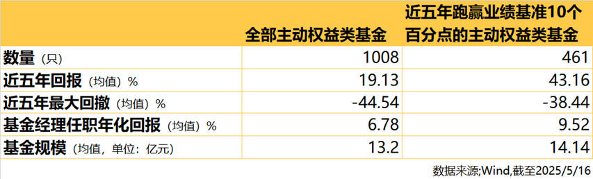 2️⃣ 选取当中近五年跑赢业绩基准10个百分点的基金。(数据截至2025/5/16)