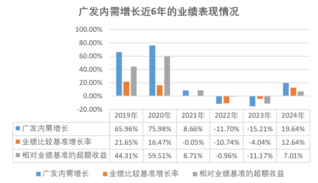 以他管理时间最长的广发内需增长A为例,近5年累计回报达43.41%,同期业绩基准仅11.91%,超越基准31个百分点。