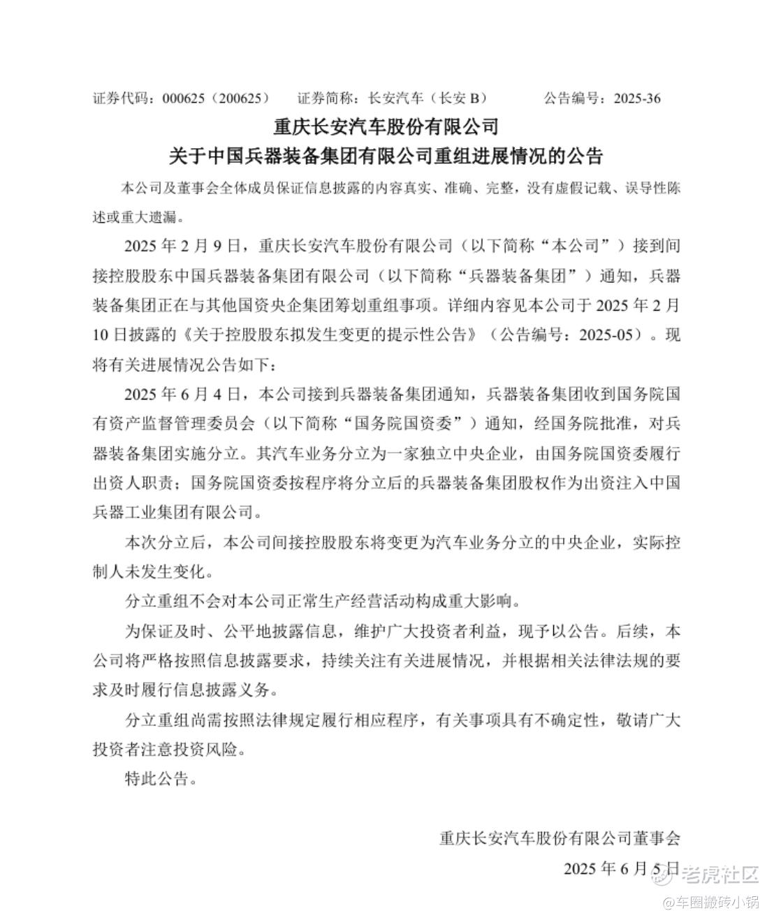 汽车行业又有重大变革消息了。今早,多家上市公司发布公告,披露了中国兵器装备集团有限公司的重组进展。长安汽车公告显示,它的汽车业务将直接分立为一家独立中央企业,间接控股股东也将变更为这个中央企业,不过实际控制人保持不变。