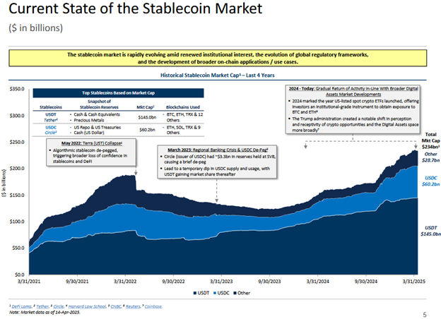 稳定币是一种数字资产,通过与储备资产(如法定货币美元)挂钩来维持币值稳定。这种稳定性使其成为链上生态系统中支付和价值储存的关键工具。