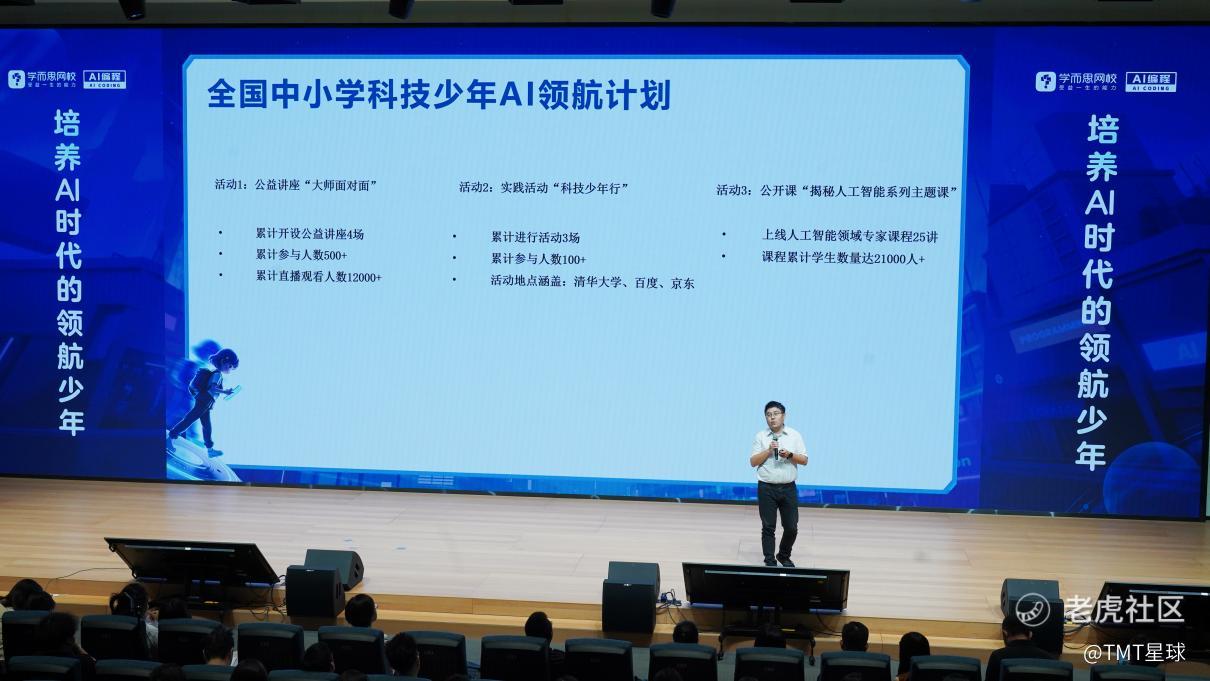中国人工智能学会中小学工作委员会副主任委员龚超宣布,学会与学而思联合启动“全国中小学科技少年AI领航计划”,该计划已开设公益讲座4场,累计直播观看人数超1.2万人次,公开课覆盖2.1万名学生。