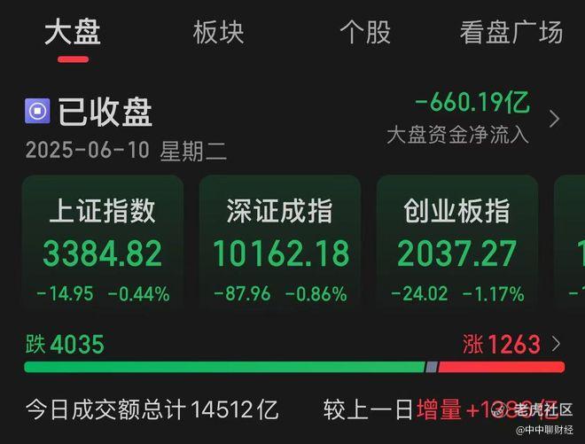 $上证指数(000001.SH)$ 6月10日星期二,A股市场三大指数午后集体走低。截至收盘,沪指跌0.44%,深成指跌0.86%,创业板指跌1.17%。北证50指数亦未能幸免,下跌1.01%。全市场成交额达到了14512亿元,相比前一个交易日增加了1386亿元。市场中超过4000只个股出现了不同程度的下跌,显示出今日市场的整体情绪偏向谨慎。
