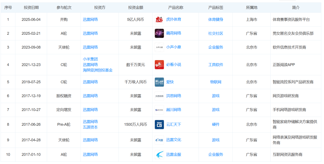 其实从 2014 年开始,迅雷一直在投资市场上活跃。基本啥都投一点,范围从硬件到游戏,从物联网到男女社交。