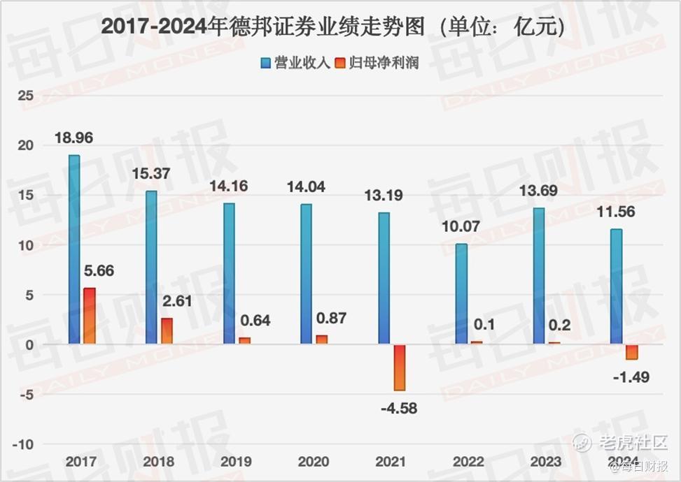 自2017年“五洋债”违约事件爆发后,德邦证券快速发展的趋势中断,2018年以来,德邦证券营业收入便一路下滑,2018年至2024年其实现营业收入分别为15.37亿元、14.16亿元、14.04亿元、13.19亿元、10.07亿元、13.69亿元、11.56亿元。不难发现,该期间内,虽然德邦证券2023年营收有所大幅回暖,但这样的势头并没维持多久,2024年再次陷入下行,同比降幅高达15.56%。