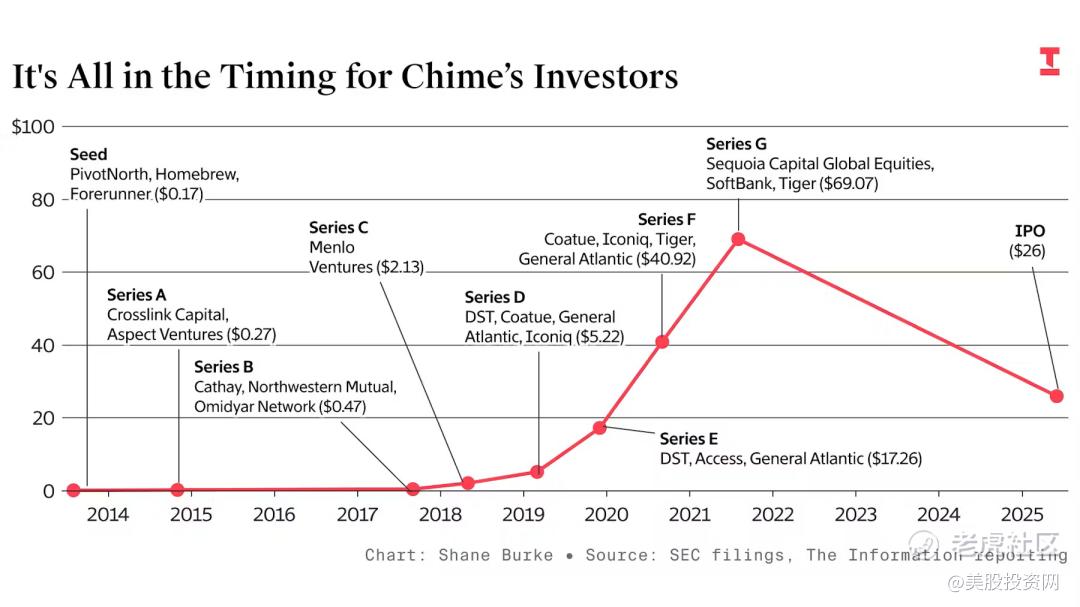 我们看这张图,Chime在疫情期间的估值曾经历显著增长。特别是Series G轮融资(2021年),其股价曾达到每股约69.07美元的峰值,反映了当时市场对其高速增长的极高预期。