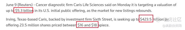 第二家是将于6月17日下周二上市的Caris Life Sciences,美股代号 $Caris Life Sciences, Inc.(CAI)$ ,这是一家长期深耕精准肿瘤诊断领域的医疗科技公司。