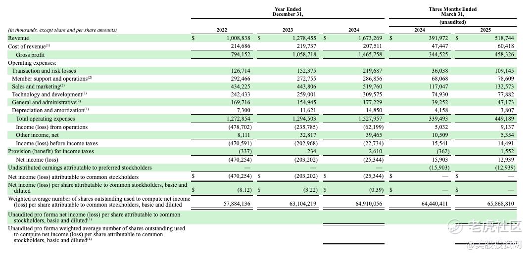 Chime的财务表现进一步验证了其商业模式的有效性。在营收方面,公司收入从2022年的10.1亿美元增长至2024年的16.7亿美元,三年累计增长约66%,主要得益于活跃用户数量和人均消费水平的稳步上升。进入2025年第一季度,Chime录得5.19亿美元的营收,较去年同期(3.92亿美元)增长32%。其中,MyPay等平台类新产品的推动作用明显,使得平台相关收入几乎翻倍,凸显了产品创新对整体增长的显著驱动效应。