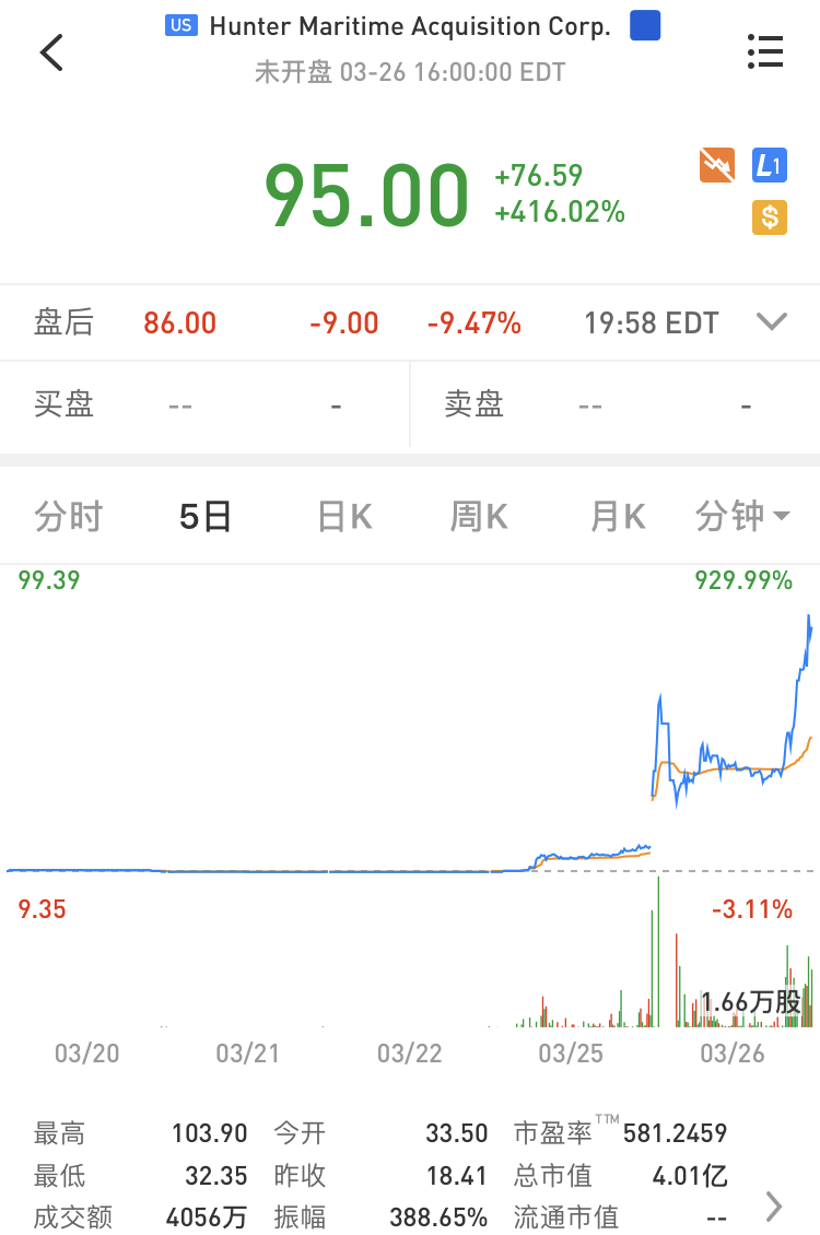 Hunter Maritime $(HUNT)$ 上个交易日暴涨416%,两天累计暴涨916%。接近10倍的涨幅让人想到一群人弯腰捡钱的场景,我们社区里就有很多这样的参与者。#何以解忧唯有暴富#