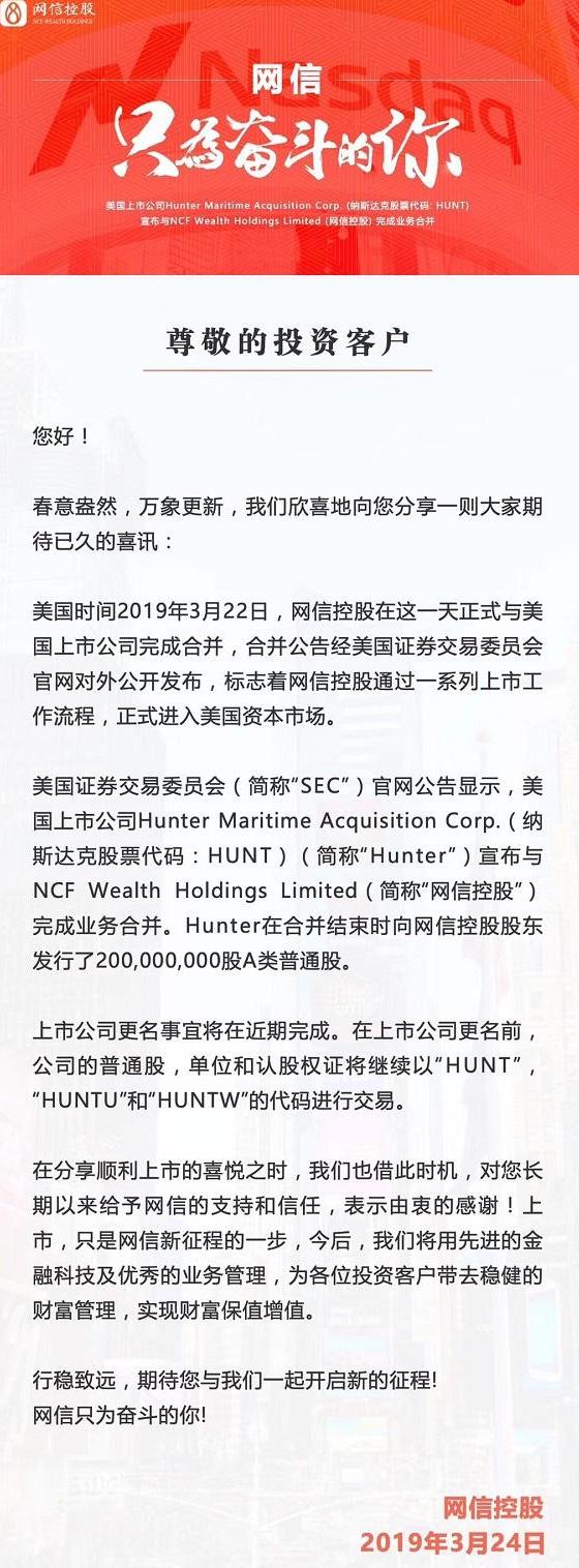 根据Hunter Maritime Acquisition Corp. 在交易所官网披露的公告,宣布与私人控股公司NCFWealth Holdings Limited(即网信控股)完成业务合并。HUNT在合并结束时向网信控股的前股东发行2亿股A类普通股。如果合并后公司2019年和2020年的财务业绩符合预期,则网信控股的前股东还有权获得高达5000万股额外的A类普通股。