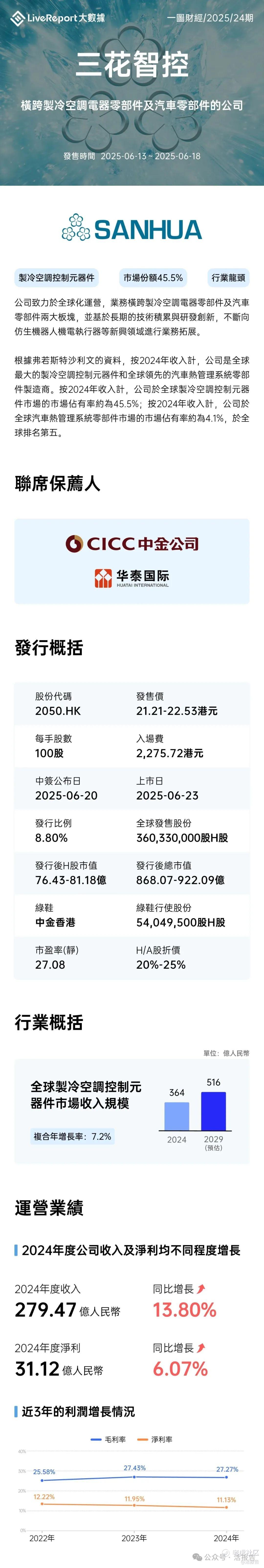 三花智控(2050.HK)招股日期为2025年6月13日至2025年6月18日,并预计于2025年6月23日在港交所挂牌上市。