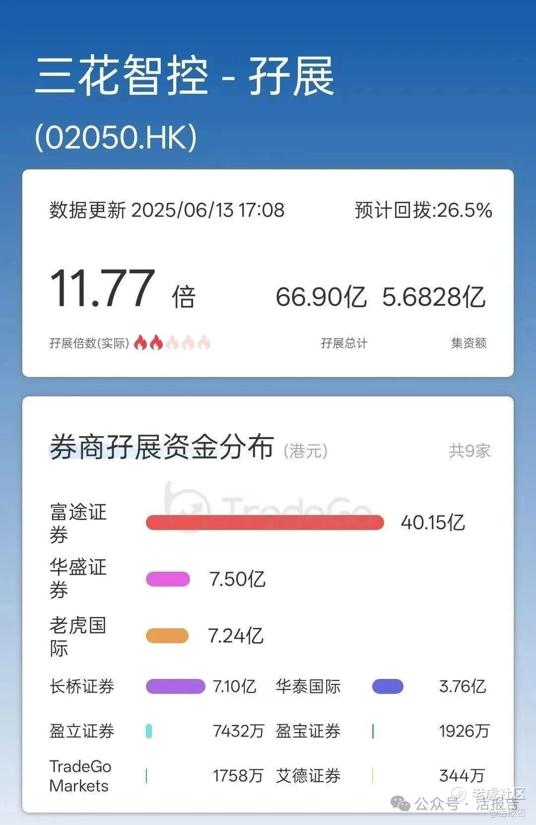 据捷利交易宝的新股孖展数据,截至6月13日17时,三花智控首日的孖展总额约66.90亿港元,孖展认购倍数约11.77倍。其中,富途证券、华盛证券及老虎国际分别放出40.15亿、7.50亿、7.24亿港元。