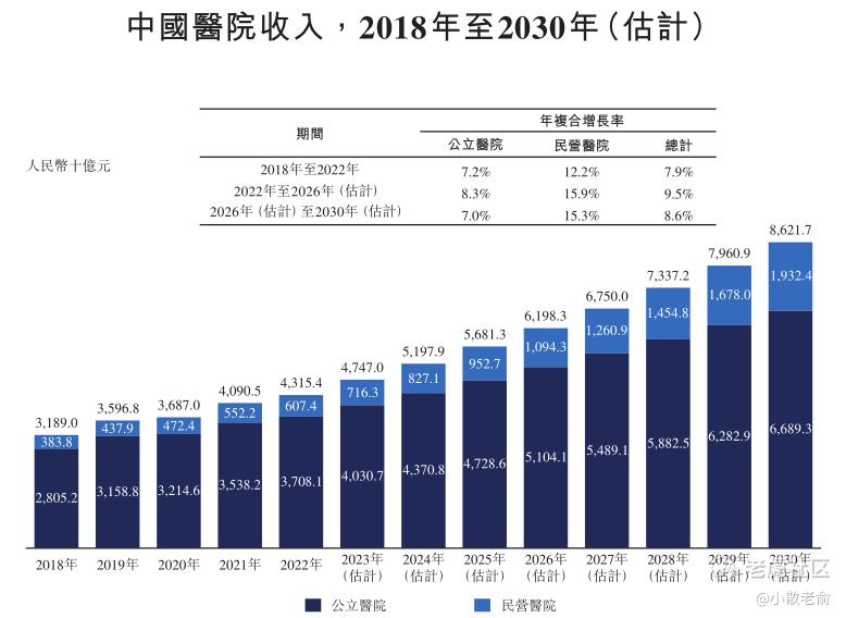 根据中国卫生健康统计年鉴,中国医院可根据所有权分为公立医院及民营医院。公立医院为国有,而民营医院由独立公司或个人拥有。就中国所有医院的收入而言,民营医院的增长速度比公立医院快。民营医院的收入从2018年的人民币3,838亿元增加到2022年的人民币6,074亿元,年复合增长率为12.2%。同期,公立医院的收入仅从人民币28,052亿元增加到人民币37,081亿元,年复合增长率为7.2%。据预测,民营医院的收入将在2026年进一步增加到人民币10,943亿元,年复合增长率为15.9%,在2030年增加到人民币19,324亿元,年复合增长率为15.3%。
