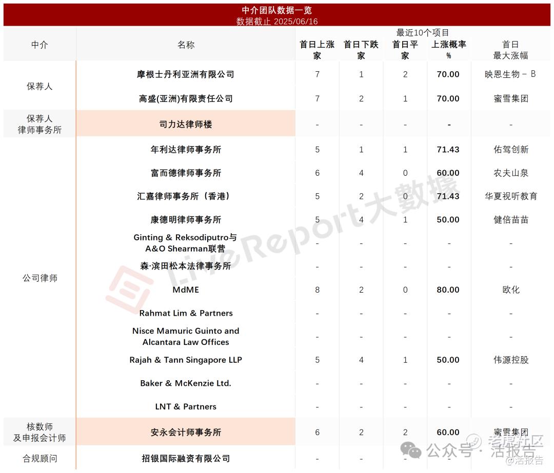据LiveReport大数据统计,富卫集团中介团队共计17家,其中保荐人2家,近10家保荐项目数据表现较好;公司律师共计12家,综合项目数据表现参差不齐。整体而言中介团队历史数据表现一般。
