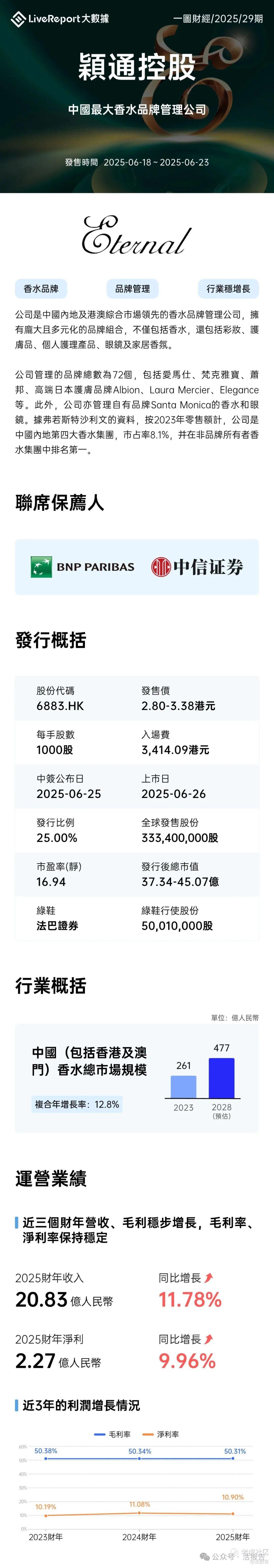 公司拟全球发售3.334亿股,发行价2.80~3.38港元,募资总额约10.30亿港元(按发行价中位数计)。发行比例为25%,发行后总市值37.34亿~45.07亿港元。