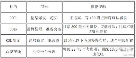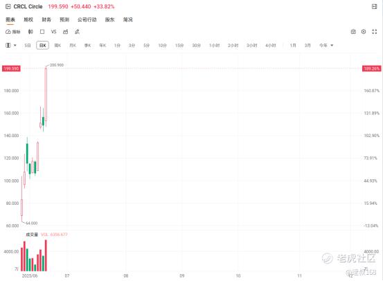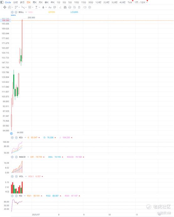 CRCL可以说是这波上涨的绝对主角,股价直接从150左右暴冲到200附近,日内拉升超过60%,K线形态非常强势。但从技术面上看,现在已经是明显超买,RSI和KDJ都在高位。我的判断是:不要追高,更稳妥的做法是等它回踩180美元一带,看有没有止跌信号再考虑介入。